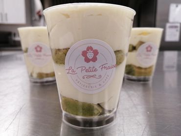 Our tiramisu cups are made with ladyfingers, while our cakes are made with layers of our matcha sponge. We layer these desserts with our signature mascarpone mix and top it off with a layer of matcha.